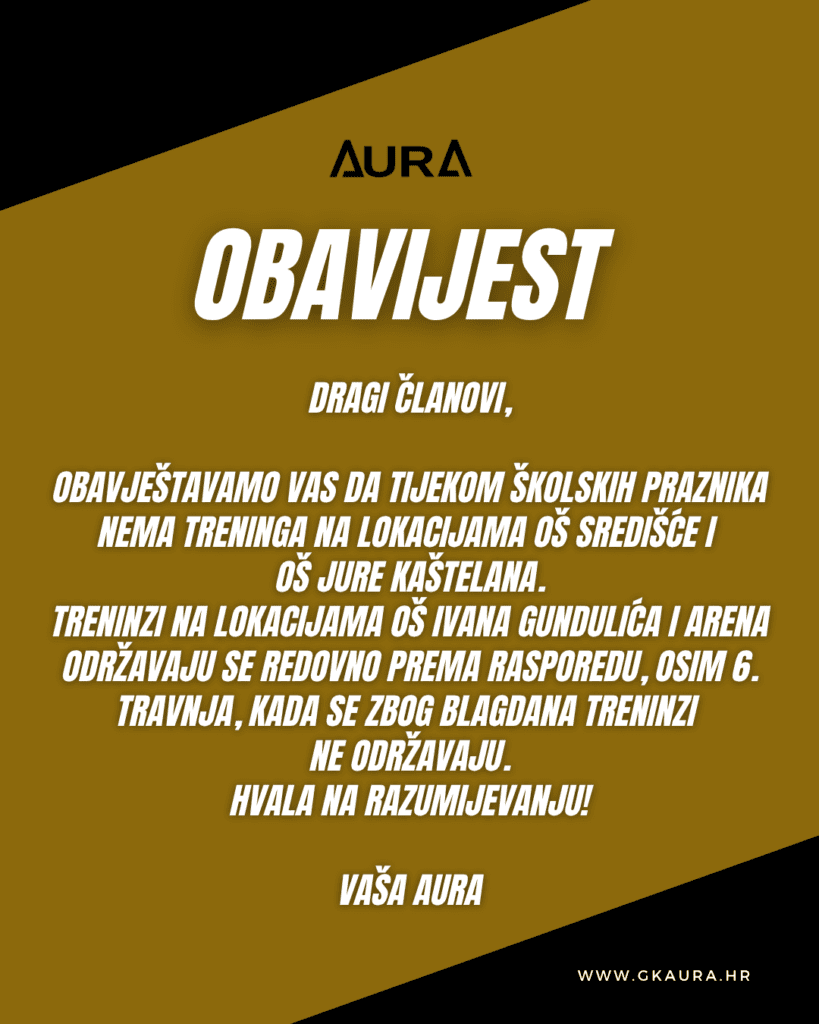 Obavještavamo vas da tijekom školskih praznika nema treninga na lokacijama OŠ Središće i OŠ Jure Kaštelan.